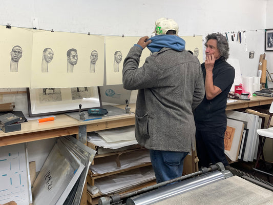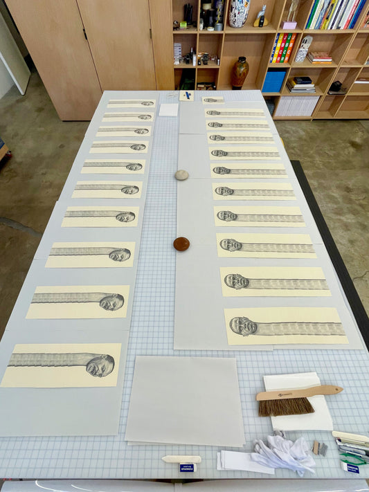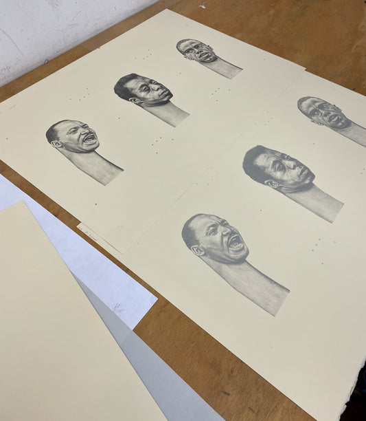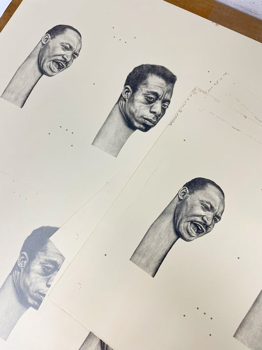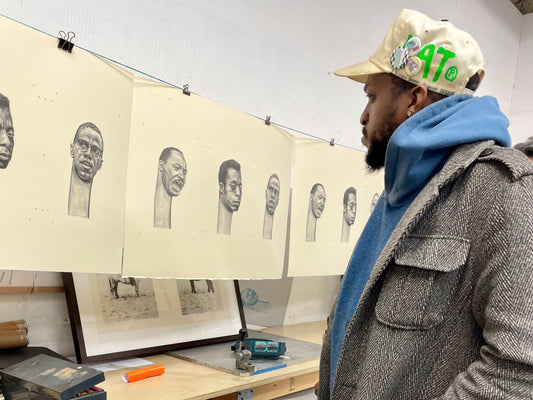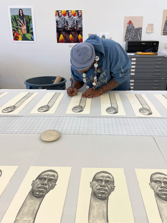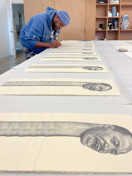 Brandon Deener (b. 1982, Memphis, TN) is a self-taught artist living and working in Los Angeles. The figures in Deener’s paintings and works on paper are instantly identifiable by his signature elongation of their necks. This distinctive gesture indicates Black pride and dignity and harkens to ritual practices employed by various tribes across Africa. While his characters are surreal, he grants them charming familiarity with titles like “French braid over the kitchen” and “Drama at the family reunion”. Deener’s take on Afro-futurism conveys a confidence and optimism that the best is yet to come.