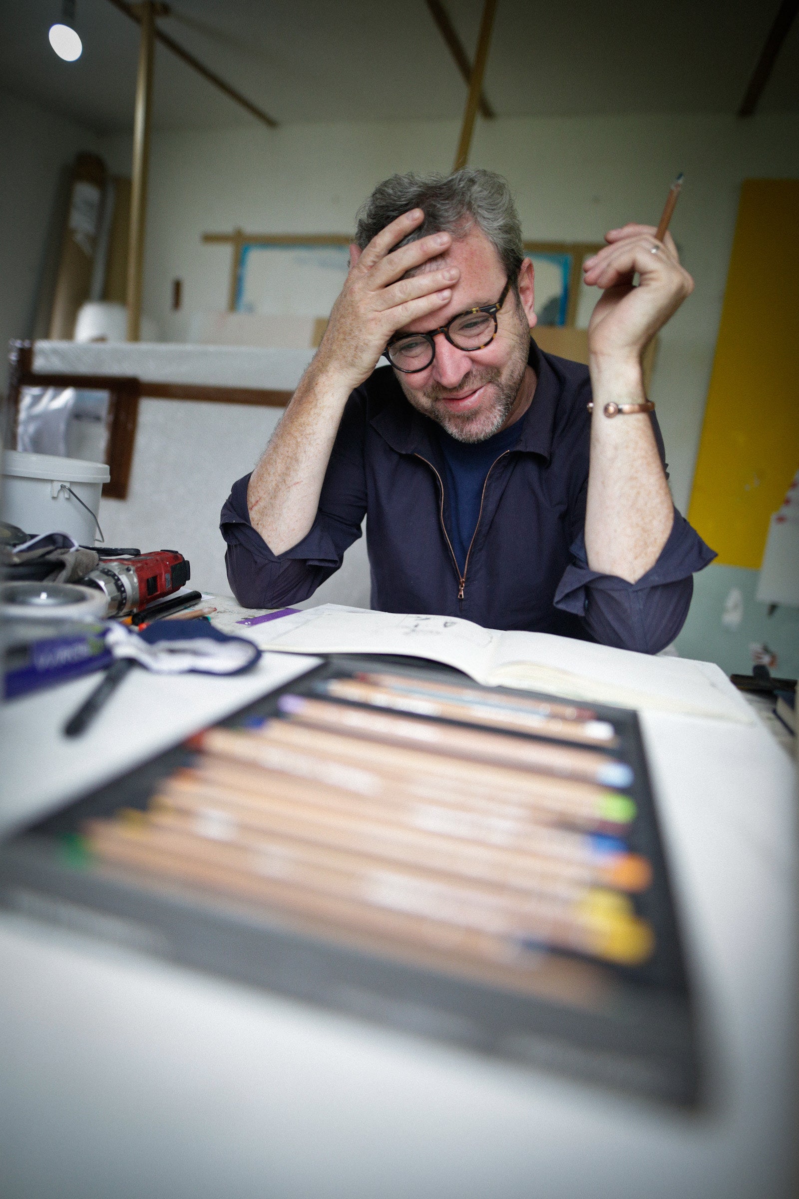 Working from a small studio at the back of his home in Thurles, Co. Ireland, where he lives with his wife and two small children, Brian Harte (b. 1978) uses the experiences of his daily life to create complex paintings of various scale. Much of his work expresses the landscape of interior spaces, where daily experiences, figures, and/or routines, exist simultaneously. Many describe banalities such as toys left behind, sweaters, crumpled beds, but they also feature the unexplainable such as dismembered legs, floating tables, and Egyptian heads. “As soon as you think there’s a narrative there, it’s gone,” he says. “But I’m looking for that. I want them to be on the edge of failure all the time.”