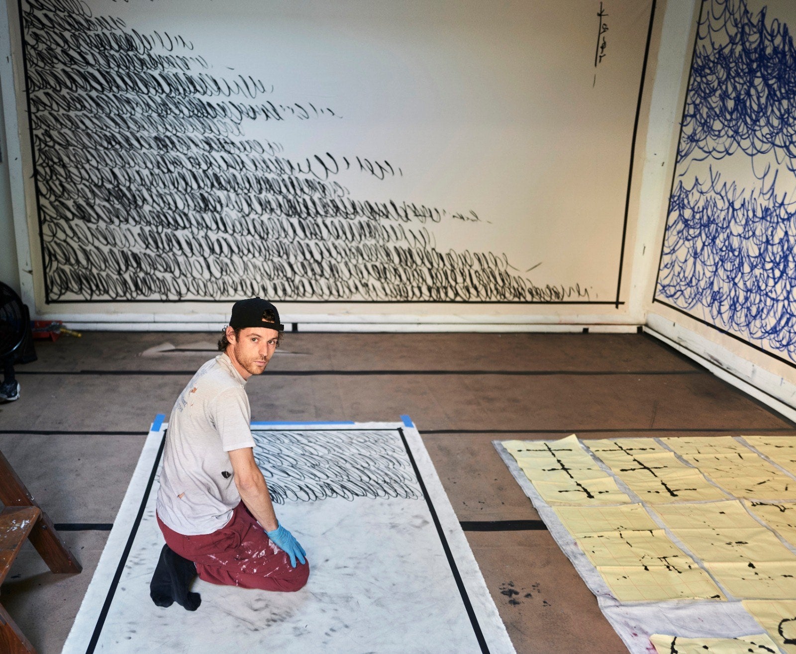 Dané Estes (born 1988, Dover, NH) is a Los Angeles-based painter and sculptor. He studied fashion at Parsons – The New School, New York. His sculptural mixed media works include oil paint, charcoal, tar, and wood. Estes’ two-dimensional works range from large-scale bold, layered, gestural oil-on-canvas paintings to more intimate oil stick-on-paper drawings. His pieces include smudges, squiggles, and meandering lines, often restricted to two or three colors or tones. There is a force to the artist’s gesture, as well as a softness, and the repetitive nature of his lines imply a seeking or searching, so that the viewer experiences the dynamic process of art-making, rather than a static, stagnant piece. As a result, Estes’ works continue to move as we enter into the space with them.