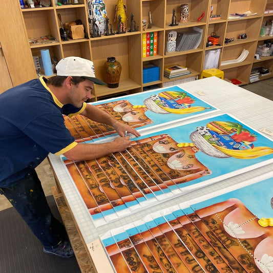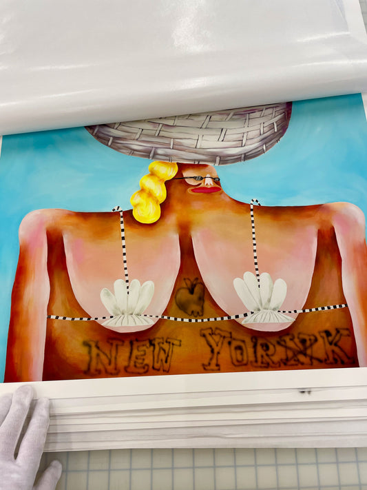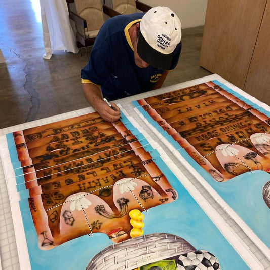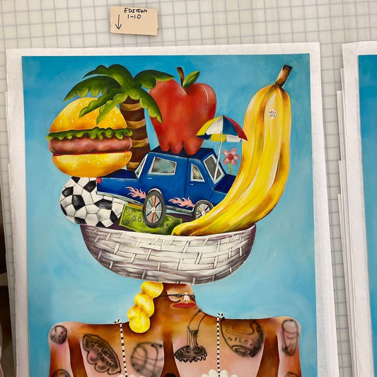 Nissan (2023) is based on a painting of the same name, but includes hand-made, airbrushed “tattoos” for each individual print, thereby making each work unique. As Hoffman explains, “Nissan” was particularly relevant to him in that it was based on Columbian palenqueras, or African-Latina women who are known to carry baskets on their heads; and that inspired him to research the history of ‘head-carrying’ as it’s known, which can be found in cultures around the world. By applying it to his own work, he’s able to depict characters who are quite literally burdened with specific thoughts, issues, and/or feelings. “We never know what someone else is going through,” he says. “And this serves as a way to portray that. The bowls of fruit become vessels for the momentous objects that occupy our minds; money, family, sports, nature.” For Hoffman that idea can also be applied to tattoos, which he uses in a similar way.