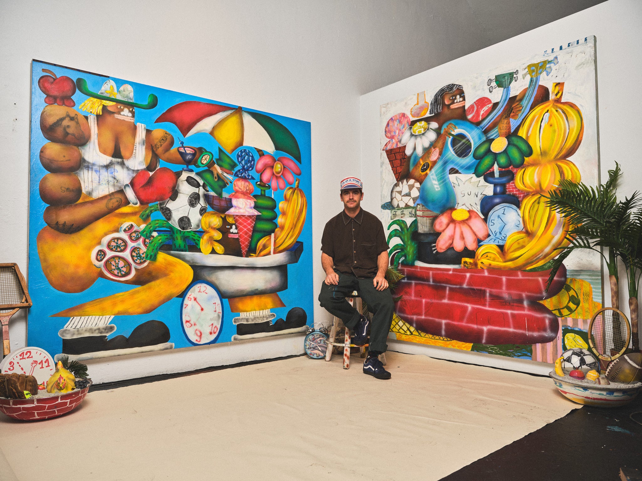 Zac Hoffman, otherwise known as Loser Angeles, uses bold colors, sinuous lines, and well-endowed shapes to create a whimsical depiction of life on earth. His work draws on what he describes as 'the oddness of the ordinary', gathering inspiration from the mundane happenings of everyday life. Hoffman was born in 1992 in San Clemente, CA, and currently lives and works in Los Angeles. He’s developed a distinct visual language with reoccurring characters and motifs, often including exaggerated depictions powerful women, clocks, and baseballs, perhaps highlighting the abundance of components weighing on the modern human. Using a variety of mediums and textures, he creates paintings that celebrate society’s run-of-the mill aspects on a monumental scale. Influenced by the novels and poetry of Charles Bukowski, his work holds a similar, honest approach of portraying daily life. Hoffman’s work has been shown in Los Angeles, Detroit, New York, London, Paris, and Beirut.